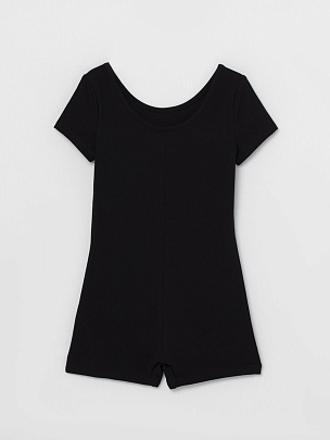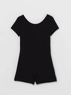 Гимнастический купальник слитный с шортиками, с коротким рукавом. Вырез горловины окантован бейкой из основного полотна.