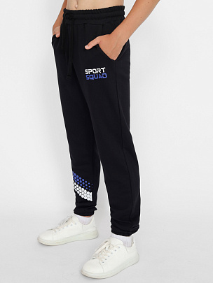 Джемпер для мальчика с длинными рукавами. Рукава втачные, с манжетами по низу. Горловина круглая, обработана воротником из полотна с эластаном. Брюки из набивного полотна с манжетами. По талии брюки собраны на резинку. Джемпер декорирован принтом.
