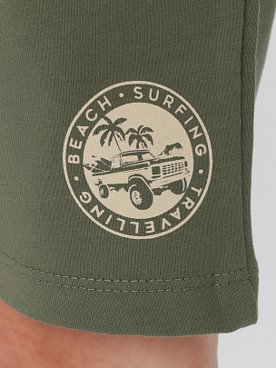 Шорты для мальчика из кулирной глади повышенной плотности. Верх шорт обработан притачным поясом из основного полотна, внутрь вставлена резинка и шнурок. На передних половинках расположен карман. Нижняя часть переда декорирована принтом.