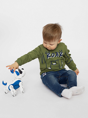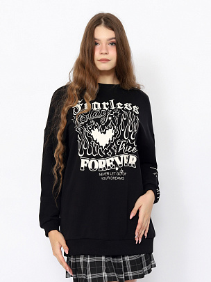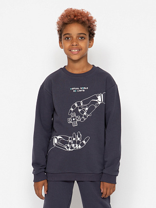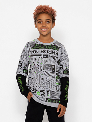 Джемпер с длинными втачными рукавами и притачными манжетами. Воротник, манжеты и пояс выполнены из полотна с эластаном. Перед декорирован принтом "Виртуальный мир без границ".