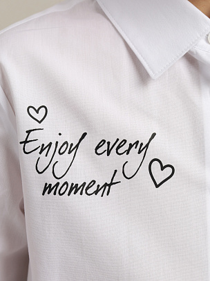 Классическая блузка из хлопка, свободного силуэта с отложным воротником и длинными рукавами с манжетами. Застёжка центральная на планку с пуговицами, декорирована принтом ввиде надписей на полочках.