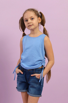 Футболка с коротким рукавом. Горловина круглая, обработана узким воротником из полотна с эластаном. Перед оформлен ярким принтом.