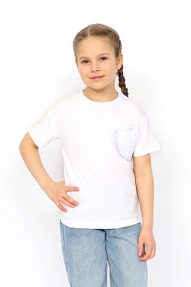 Футболка с коротким рукавом. Горловина круглая, обработана узким воротником из полотна с эластаном. Перед оформлен ярким принтом.